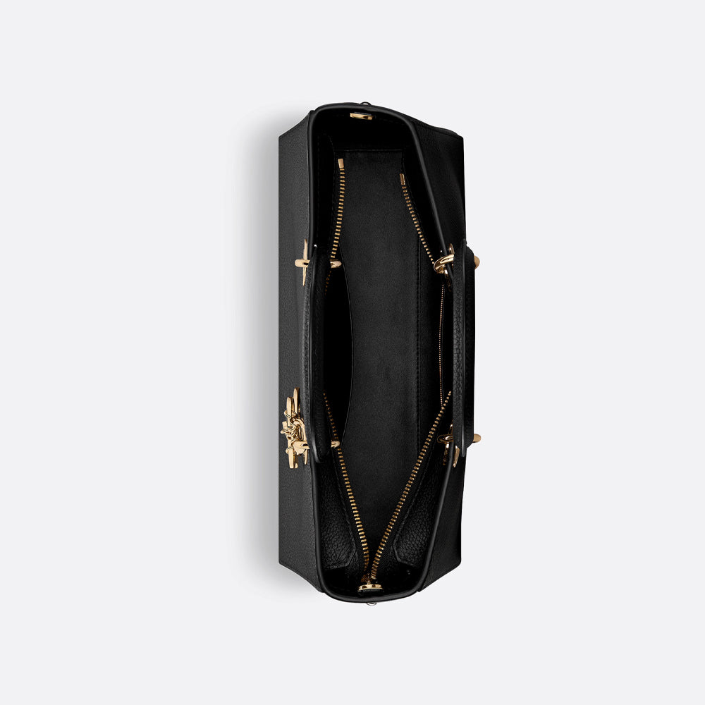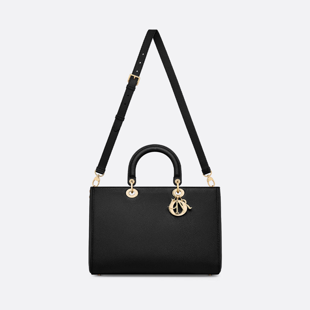 New for Summer 2024, the Lady D-Sire bag draws inspiration from the signature elegance of the Lady Dior design. Reimagined with a casual style for an urban look, the lightweight black grained bull leather feels soft to the touch yet offers excellent durability. The large style is embellished with pale gold-finish metal D.I.O.R. charms highlighting the silhouette. Showcasing a removable, thin leather shoulder strap, the unique bag can be carried by hand or over the shoulder.