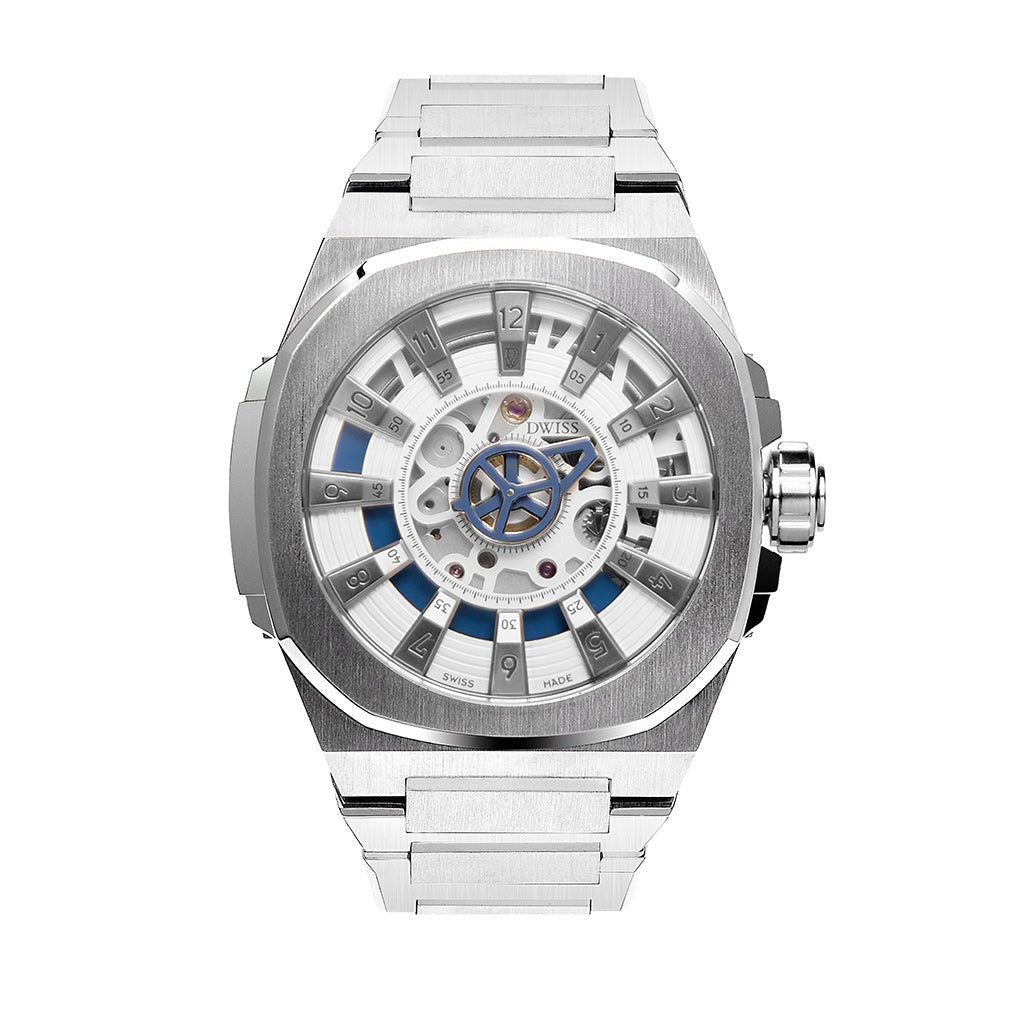 Dial: White dial with with blue accents, and DWISS signature mysterious hours