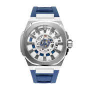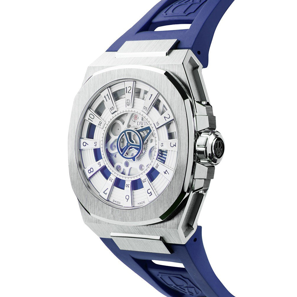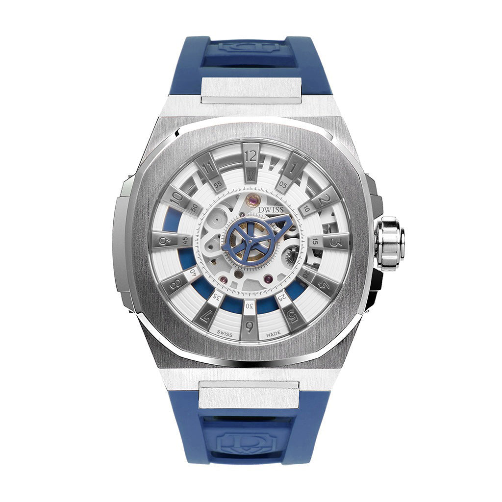 Dial: White dial with with blue accents, and DWISS signature mysterious hours
