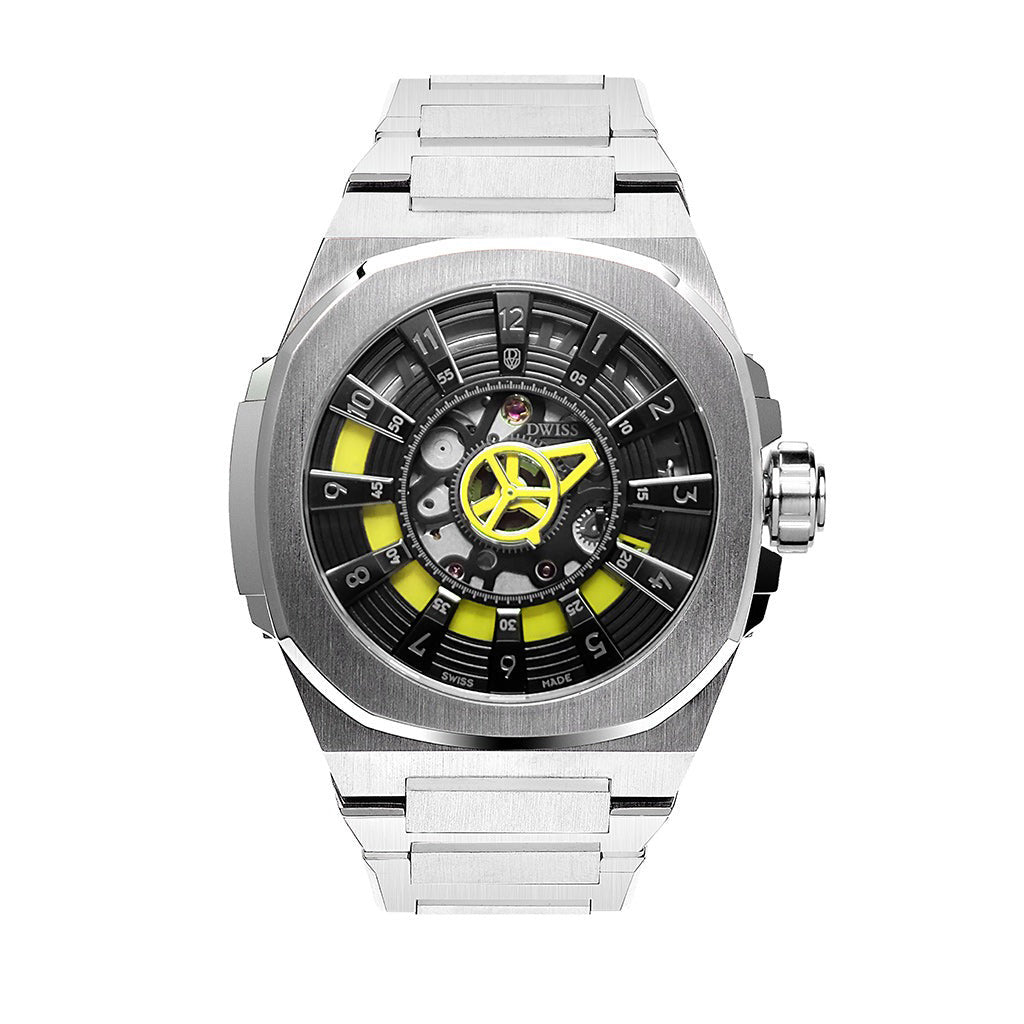 Dial: White dial with with blue accents, and DWISS signature mysterious hours
